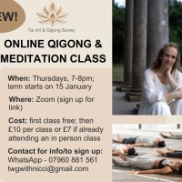 Nicci is currently teaching weekly Qi Gong (taijiwuxigong) and tai chi (Taiji37 form and long form) classes in Reigate on Wednesdays and runs an online Qi Gong and Meditation class on a Thursday evening as follows:
